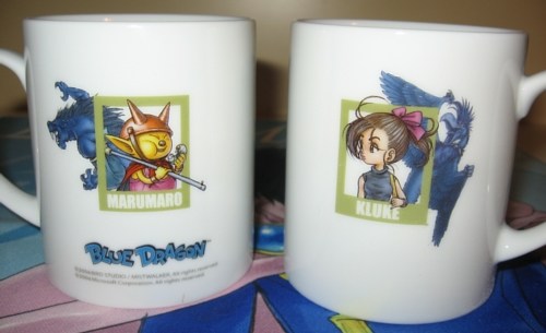 J’avais commandé il y a quelques temps deux mugs Blue Dragon, que je viens de recevoir. Ca ira bien avec ma petite collection! Quant au truc sous les mugs, c’est une serviette à l’effigie de mon personnage préféré de Tales of Destiny (ça me fait une jolie nappe :D).